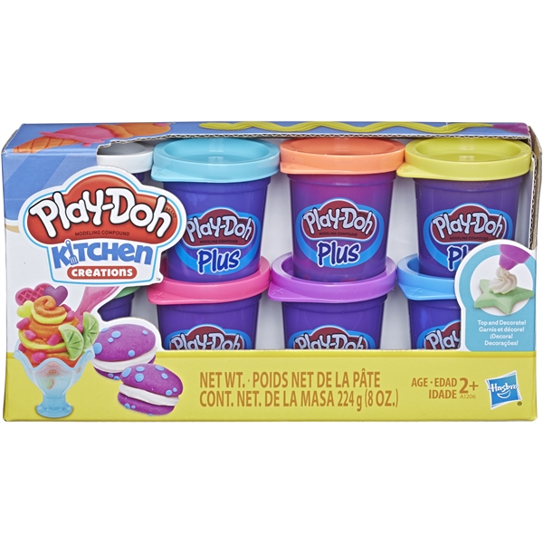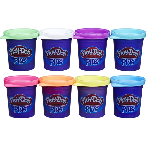 Se till att du har all lera du behöver till dina designer och dekorationer. Setet innehåller 8 Play-Doh Plus-burkar, en mjukare, smidigare och bekvämare Play-Doh-lera som du kan designa och dekorera med!