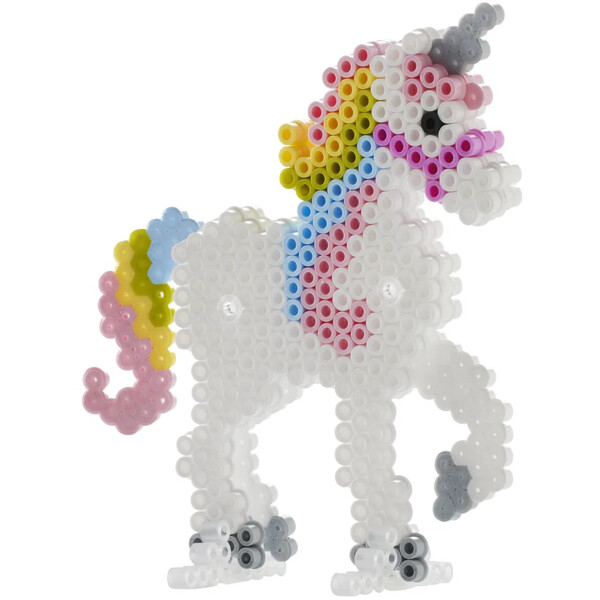 Hama Midi Box Unicorns 2000 st är ett set med cirka 2000 pärlor, 1stor sexkantig pärlplatta (nr276), 4pärlstöd, 1HamaGem, motivmönster, vägledning och strykpapper.