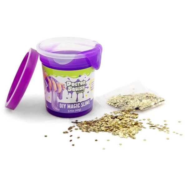 Doctor Squish älskar att hitta de bästa kramleksakerna och se vad som finns inuti! Hon gillar att skapa sina egna krambollar och allt det som kan kramas. Du kan fylla det lila slimet med det magiska glitter, som följer med slimet.