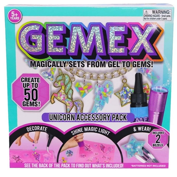 Gemex Unicorn är ett pysselset där ni kan skapa massvis med häftiga pyssel och kreationer. Detta magiska set förvandlar gelen till smycken eller andra accessoarer på bara några få minuter. Gäll gelen i formerna, dekorera gelen med glitter, pärlor, blommor eller med vad du vill, lägg sedan formerna i pärlan som har en UV-lampa. Låt ligga i 3 minuter för att gelen ska hinna stelna och sedan är ditt nya smycke är klart.