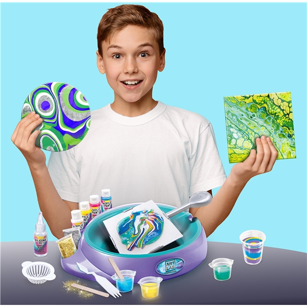 Skapa dina egna målningar med Pouring Art Studio. Blanda färgerna och skapa otroliga konstnärliga effekter med hjälp av verktygen som ingår i paketet. Det blir ännu roligare när varje målning är helt unik!