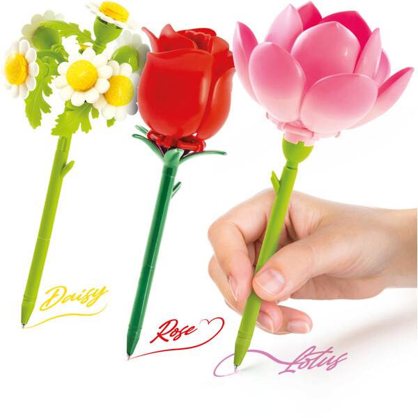Med det här paketet kan du bygga dina egna 3 pennor genom att skapa vackra blommor av färgglada klossar.