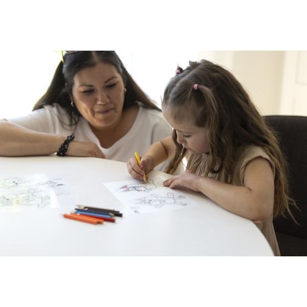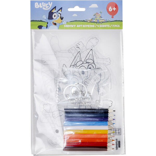 Setet innehåller fyra ark krympplast med sju motiv, tio pennor, två nyckelringar och nio kedjor. Allt som behövs för ett kreativt och roligt pyssel till alla små Bluey-älskare!