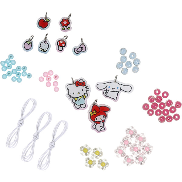 Här finns 60 pärlor i olika färger, nio fina berlocker med Hello Kitty och elastiskt snöre allt som behövs för att skapa tre personliga armband. Barnen trär enkelt pärlor och berlocker på snöret och knyter ihop. Sen har dom egna smycken att bära med stolthet eller ge bort som present till en kompis!