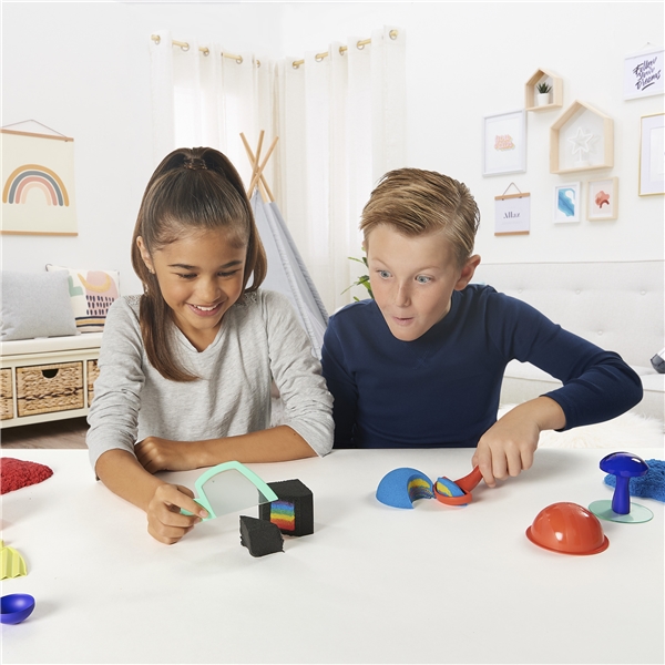 Med över tio olika verktyg och formar och två pund sandlera finns det så många sätt att skapa! Fluffa upp sanden innan du leker så att den blir smidig! Kinetic Sand är originalversionen av den fascinerande sanden som flyter genom dina händer och torkar aldrig ut så att du kan leka om och om igen. Med röd, blå, gul och sällsynt svart kinetisk sand kan du blanda dem ihop för att skapa nya färger eller lägga till marmordesign till dina skapelser. Skär, dra, forma, skopa och kläm din Kinetic Sand!