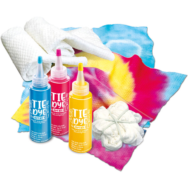 Innehåller: flaskor med färgpulver (3 färger), tråg, handdukar (2 st atttesta tekniker på), handskar, gummiband och instruktioner.