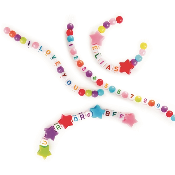 Innehåll:Bokstavspärlor (med hela svenska alfabetet)SifferpärlorPärlor (olika färger)Elastiska bandInstruktionshäfte