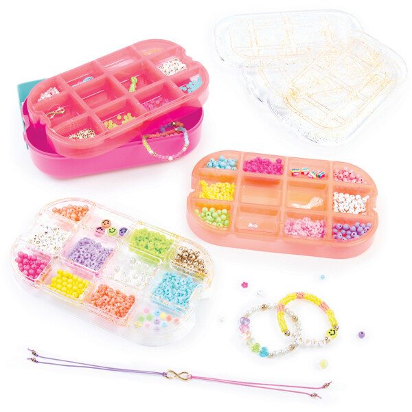 Med smarta detaljer som hjälper dig att lägga ut pärlmönster, mäta snörlängd och sortera utvalda pärlor, blir det enkelt att skapa. Barnen kan lätt förvara allt sitt material och använda det bekväma handtaget för att ta med sig setet till lekträffar eller varhelst inspirationen slår till!