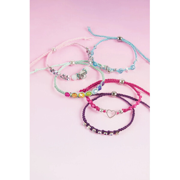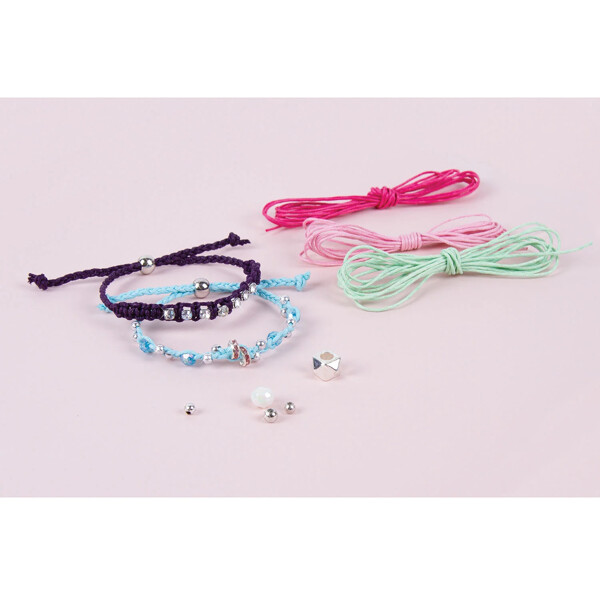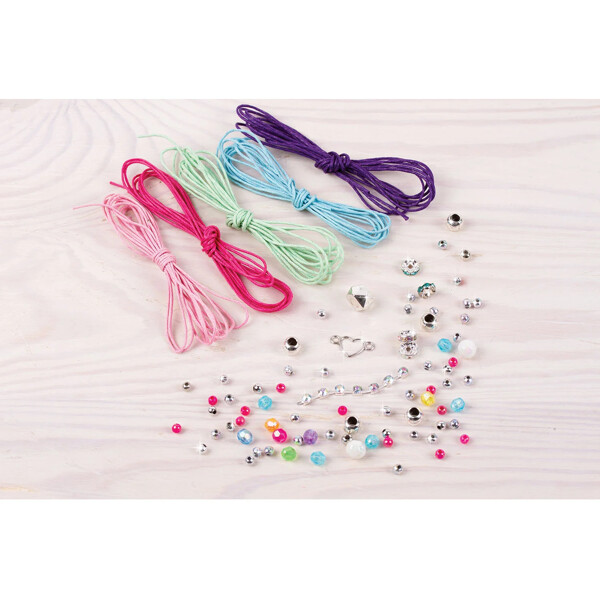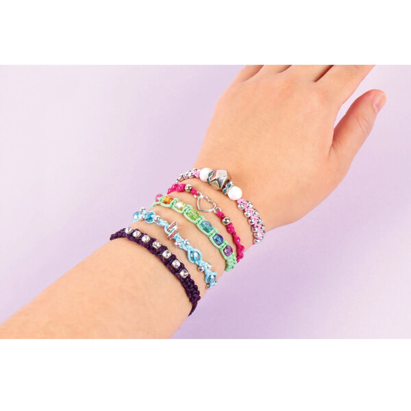 Lär dig enkla knyttekniker för att skapa fem vackert utformade armband med hjälp av detta omfattande kits mix-and-match vaxade snören och trendiga pärlor.