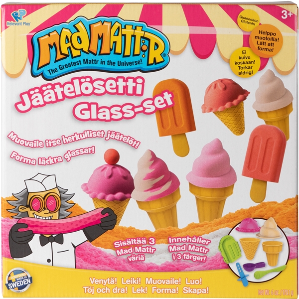 Leksand, som man kan forma, knåda, trycka och dra i så mycket man vill. Mad Mattr torkar aldrig och den är supermjuk och lätt att jobba med. Lätt att städa upp, kladdar inte. Innehåller inte vete, gluten eller kasein. Glasskiosken serverar vaniljglass, jordgubbsglass och tropiska blandningar. Gör fina strutar och pinnar, enfärgade eller som fantasifulla blandningar.