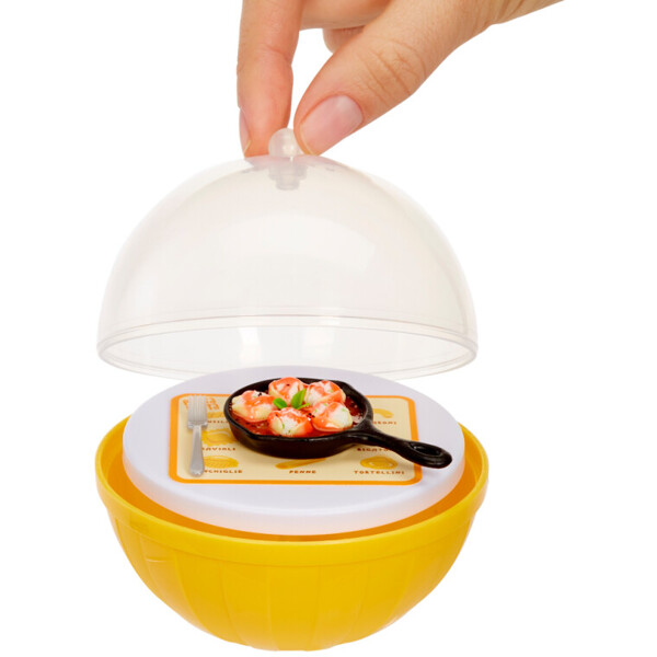 Varje kula innehåller porslin, köksredskap och 4-5 ingredienser för att skapa läckra rätter. I kulan finns det också ett fint bord som du kan använda för att visa upp dina skapelser och presentera dem för vännerna.