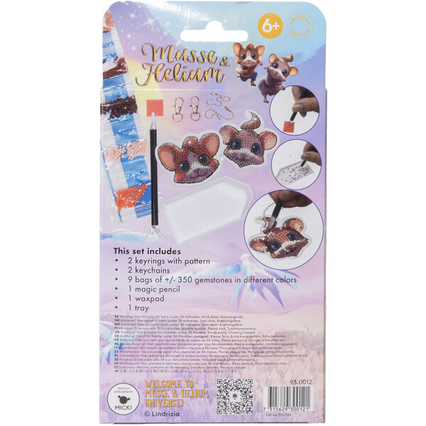 Med detta kreativa set kan barnen skapa sin egen nyckelring genom att fästa små diamanter på plattan. Följ siffrorna, plocka upp rätt färg med pennan och fäst diamanterna på rätt plats. Bit för bit växer ett magiskt Musse & Helium-motiv fram!