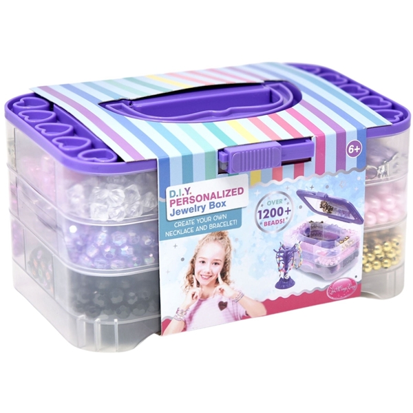 Den här fina pärlboxen innehåller mer än 1200 pärlor och låter dig designa dina egna armband och halsband! Setet innehåller tråd i olika färger, olika sorters pärlor, berlocker och alfabetspärlor. Du får även med så att du kan sätta ihop ett eget smyckesställ där du kan hänga dina färdiga armband. Pärlboxen har tre våningar med fack fyllt av pärlor och tillbehör.