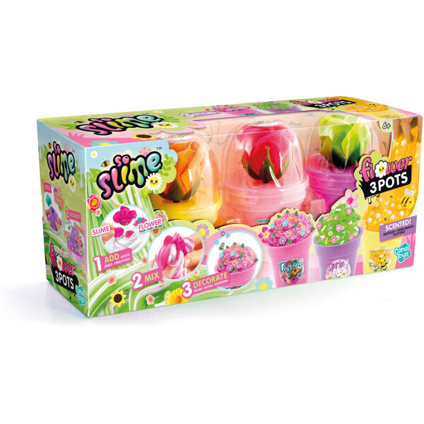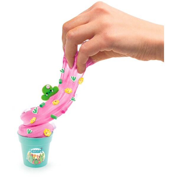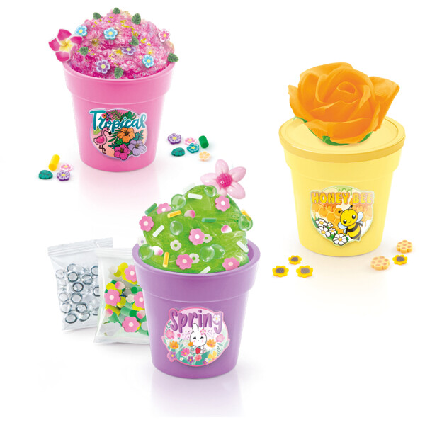 Krukorna innehåller doftande slime och färger som löses upp i slimet och ger det en vacker färg. Till sist dekorerar du med söta smycken och din skapelse är klar.