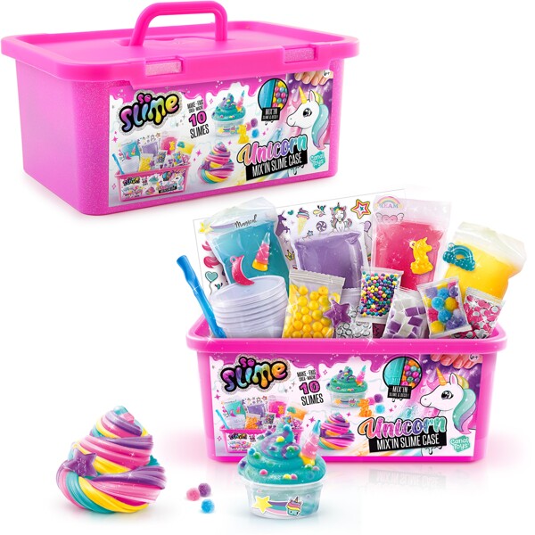 Utforska känslofullt enhörningslime i det här setet. Du kan leka med alla komponenterna och dekorationen ovanpå lådan och förvara allt inuti när du har lekt klart. Gör dig redo för en mängd känsloupplevelser eftersom allt det som du behöver finns redan i lådan, som du kan ta med dig överallt.
