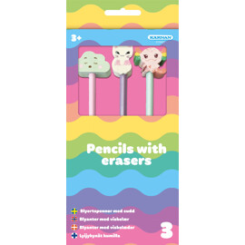 Ett fint set med tre blyertspennor med söta suddisar. Pennorna kommer ovässade i härliga pastellfärger och pryds med söta sudd i form av ett moln, en katt och en axolotl.