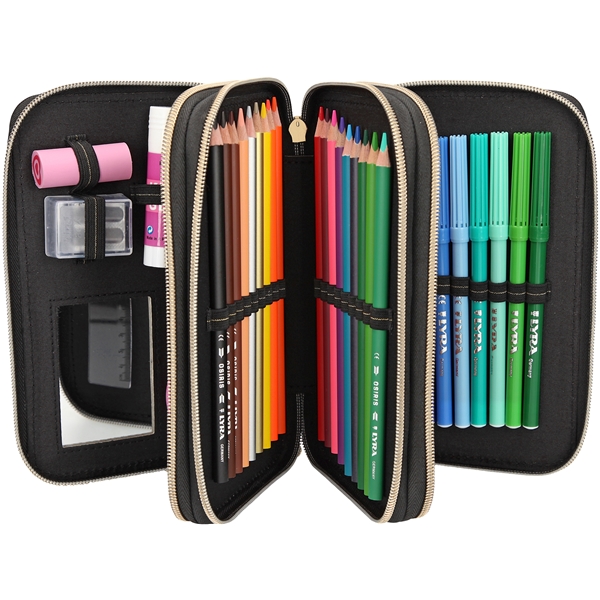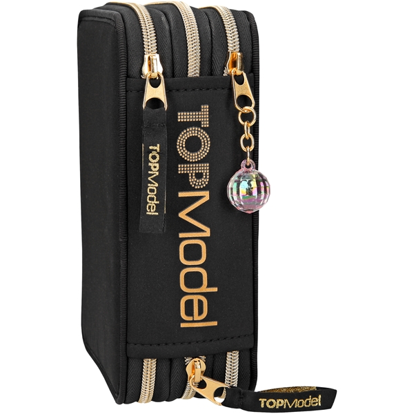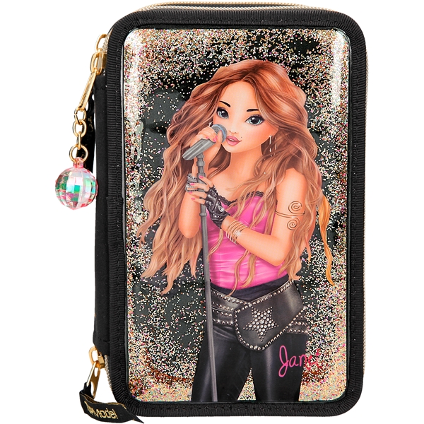 TOPModel Trippelpennfodral Svart med Glitter är ett glammigt och praktiskt pennfodral i en snygg TOPModel design med flytande glitter på framsidan som har tre stora fack fyllda med allt man kan behöva för att rita och skriva både i skolan och hemma. Pennfacket kommer med 18 färgpennor, 18 tuschpennor, blyertspennor, kulspetspenna, suddgummi samt mycket, mycket mer. Den är ett måste för alla TOPModel-fans och alltid en uppskattad present.