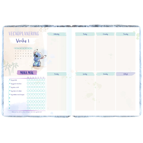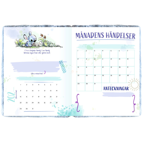 Med Stitch blir varje dag en bra dag! Gå in i hans värld, rita, planera och ha kul. Här hittar du tänkvärda citat, serier och plats för planering, klotter och dina mål. Fyll kalendern med glädje!