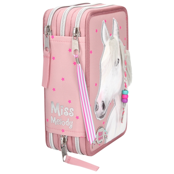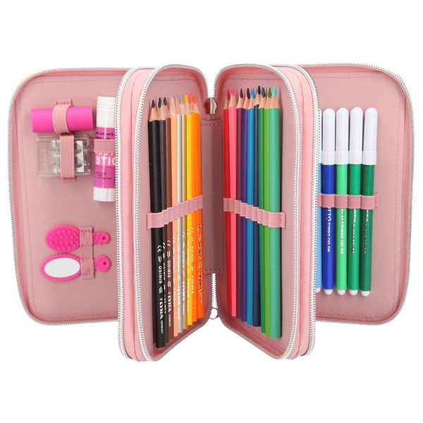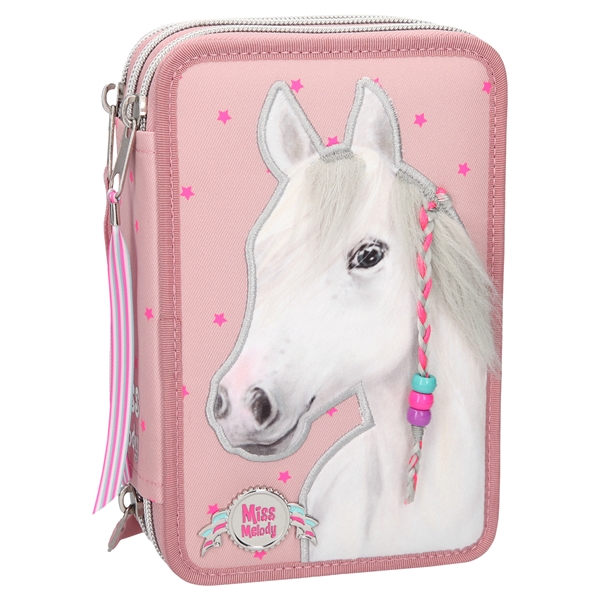 Miss Melody Pennfodral Trippel är ett lika vackert som praktiskt pennfodral med tre stora fack som är fyllda med allt man kan behöva för att rita och skriva både i skolan och hemma. Pennfodralet innehåller många olika färgpennor, bland annat fiberpennor, blyertspenna, kulspetspenna samt suddgummi och mycket mer.