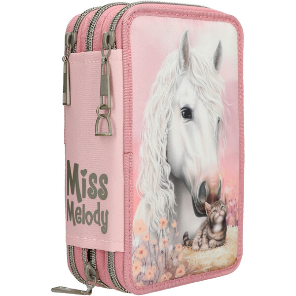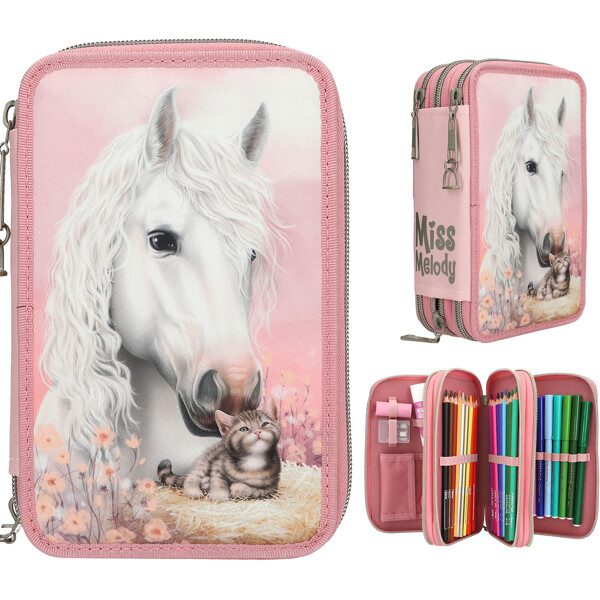 Detta fina pennfodral i rosa från Miss Melody TRUE FRIENDS-serien har ettstort motiv av en vit häst och en liten kattunge på en höbal omgiven av vackra blommor.
