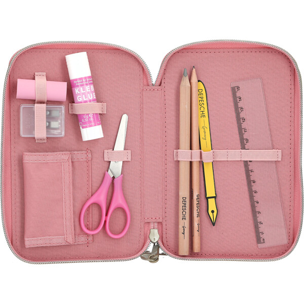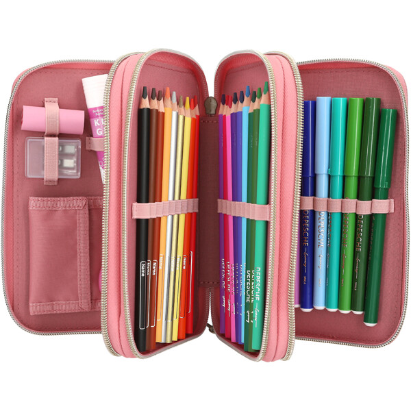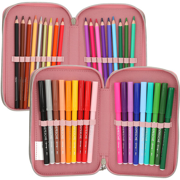 De tre separata facken är komplett fyllda med allt som behövs för att rita, skriva och pyssla: vardera 18 färg- och tuschpennor, 2blyertspennor, pennvässare, suddgummi, linjal, sax, limstift samt en litenkardborreficka.