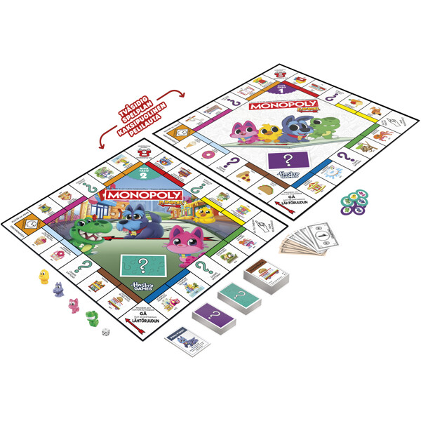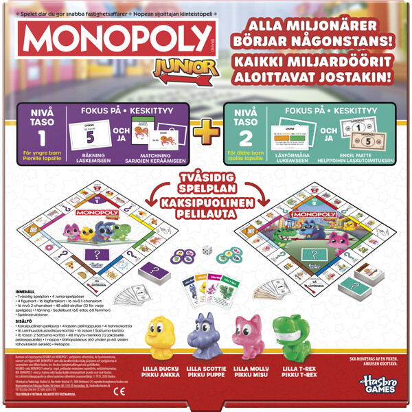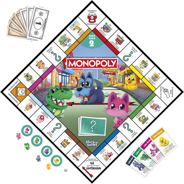 Varje miljardär börjar någonstans! Detta 2-i-1 Monopol Junior-spel för barn har ett dubbelsidigt bräde och 2 svårighetsgrader, så familjer kan bestämma vilken nivå som passar dem bäst.