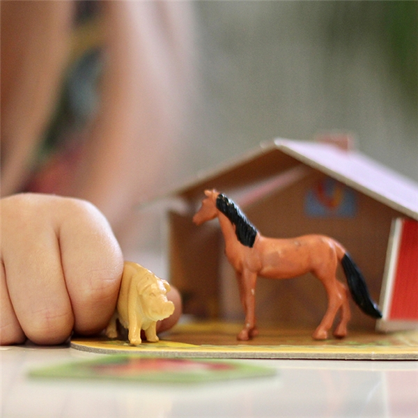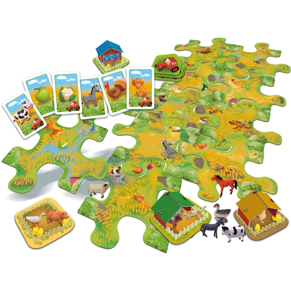 Välkommen till bondgården! Sätt ihop planen bestående av stora pusselbitar. Leta sedan efter och peka på bondgårdsdjuren som visas på korten. Om du är före de andra spelarna belönas du med en djurfigur.