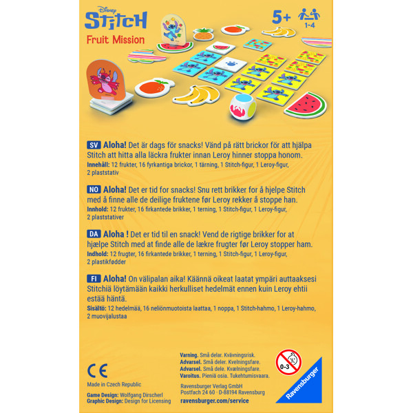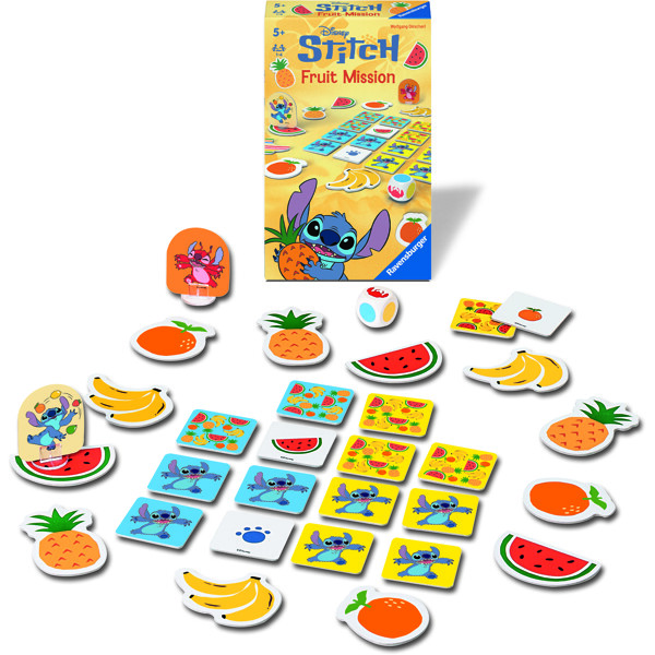Innehåller: 12 frukter, 16 fyrkantiga brickor, 1 tärning, 1 Stitch-figur, 1 Leroy-figur, 2 plaststativ.
