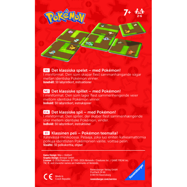 Spelarna turas om att lägga brickor och bygger tillsammans en ständigt föränderlig labyrint! Målet är att skapa en sammanhängande väg mellan två likadana Pokémon. Lyckas du, får du behålla brickan som redan ligger i labyrinten. Vem samlar flest brickor – och flest Pokémon som Pikachu, Bulbasaur, Squirtle och många fler?