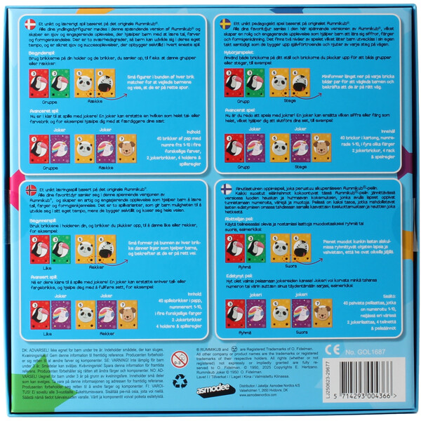 Ett unikt pedagogiskt spel baserat på originalet Rummikub. Alla dina favoritdjur samlas i den här spännande versionen av Rummikub, vilket skapar en rolig och engagerande upplevelse som hjälper barn att lära sig siffror, färger och formigenkänning. Det finns två nivåer av spelet vilket låter barn utvecklas i sin egen takt samtigit som de bygger upp självförtroende och njuter av varje steg på vägen.