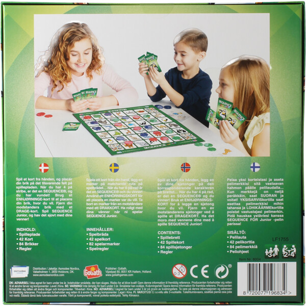 Sequence Junior är ett roligt och enkelt familjespel som är perfekt för yngre spelare att delta i. Spelet går ut på att placera markörer på spelplanen genom att matcha kort från handen. Målet är att vara den första spelaren som får 4 markörer i rad, antingen diagonalt, vertikalt eller horisontellt.I Sequence Junior finns det även speciella Enhörnings- och Drakkort som ger extra möjligheter och strategier i spelet. Enhörningskortet tillåter spelaren att placera en markör var som helst på spelplanen, medan Drakkortet tillåter spelaren att ta bort en markör från en motståndares rad.Spelet levereras med en tydlig regelbok på svenska, finska, norska och danska. Det är utformat för att vara enkelt att förstå och spela för barn från 3 år och uppåt. Sequence Junior kan spelas av 2-4 spelare, vilket gör det till en perfekt aktivitet för familjesammanhang och spelkvällar.Sequence Junior är ett underhållande spel som hjälper till att utveckla strategiskt tänkande och samarbetsförmåga hos yngre spelare. Det är en rolig och interaktiv aktivitet som hela familjen kan njuta av tillsammans.Regelspråk: Svenska, Finska, Norska och Danska.Antal spelare: 2-4.
