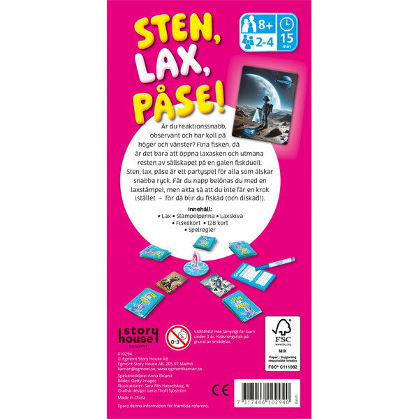 Är du reaktionssnabb, observant och har koll på höger och vänster? Fina fisken, då är det bara att öppna laxasken och utmana resten av sällskapet på en galen fiskduell. Sten, lax, påse är ett partyspel för alla som älskar snabba ryck. Får du napp belönas du med en laxstämpel, men akta så att du inte får en krok istället - för då blir du fiskad (och diskad!).