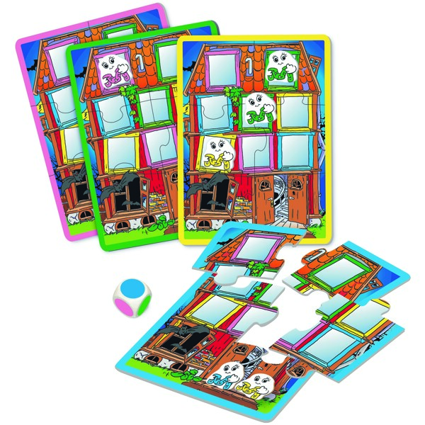 Innehåll: 4 spelplaner (varje spelplan består av 6 pusselbitar), 32 spökungar, färgtärning och spelregler.