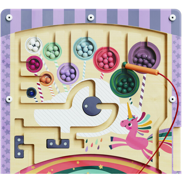 En magnetiskt unicornlabyrint i trä. Ett kul spel för att lära dig räkna, där du ska föra de färgade kulorna genom labyrinten och sortera dem till rätt fack med hjälp av magnetpennan.