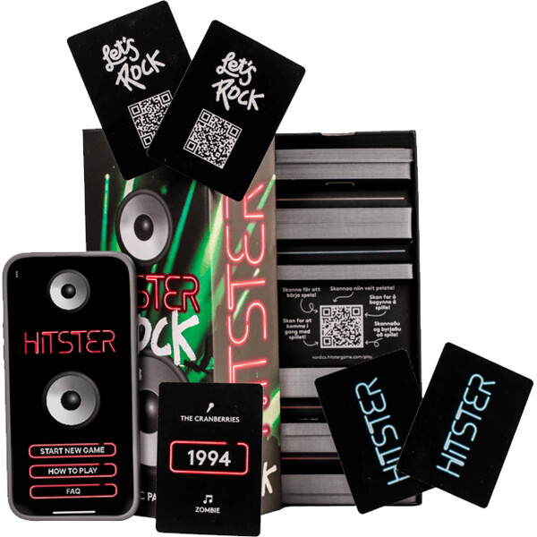 Hitster Rock med över 300 rocklåtar från blandade årtal. Placera in rockhits i rätt ordning på din tidslinje!Hitster är det perfekta partyspelet där du ska bygga en tidslinje med över 70 år av hits. Lyssna på gamla och nya hits och turas om att lägga dem i kronologisk ordning på din tidslinje. Den spelare som först samlar 10 hits vinner! Du behöver inte kunna exakt vilket år låten släpptes, utan endast kunna placera låten i rätt förhållande till de andra. Fristående spel. Du behöver inte ha det första spelet för att kunna spela detta, det fungerar som ett eget spel eller så kan du bygga på ditt andra med extra låtar.Ett familj/partyspel med enkla regler och massor av härlig musik!Innehåll: 300 kort med musikhits och 30 hitsterkort för att öka dina chanser att vinna.Spelet kräver en mobiltelefon med musikstreamingtjänst (ingår ej). Skanna korten med Hitster-appen så spelar Spotify upp den automatiskt.Regelspråk (nordic): Svenska, finska, danska, isländska och norska.Antal spelare: 2-10Speltid: ca 30-60 min