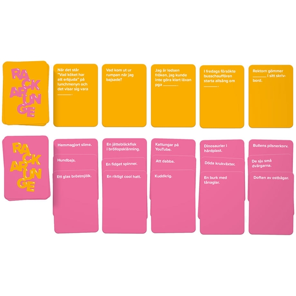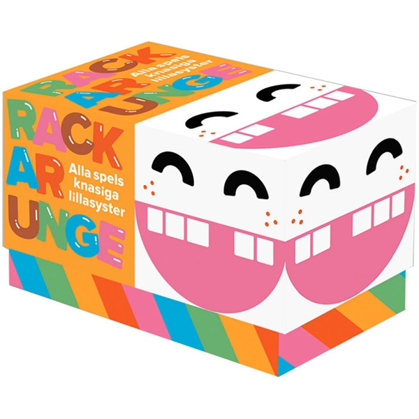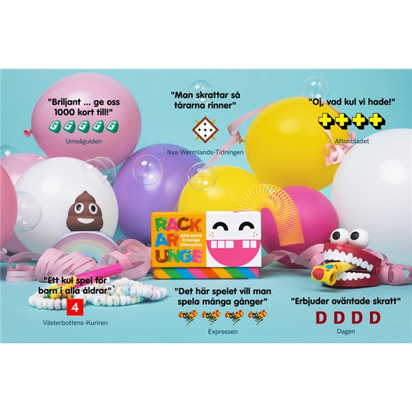 Rackarunge är den familjevänliga och färgglada varianten av det populära, vulgära festspelet Rackare. Det har sålts över 25 000 exemplar Rackare. Innehåll: 450 kort, 1 regelhäfteÅlder: 6+Antal spelare: 3-20 spelareSpeltid 30-60 minuter.
