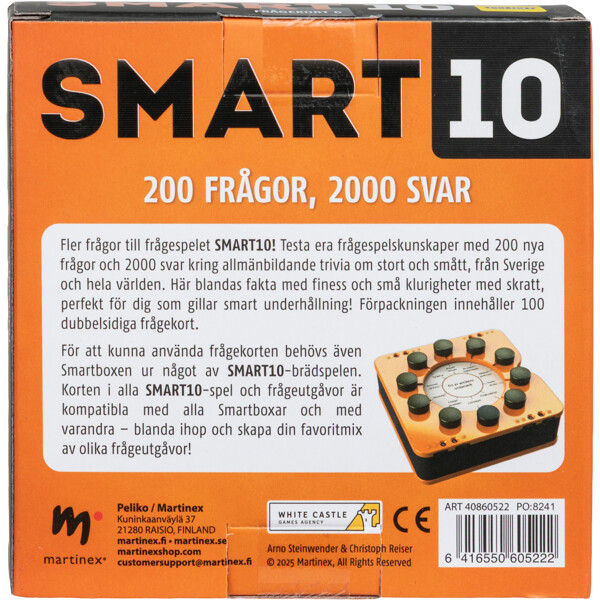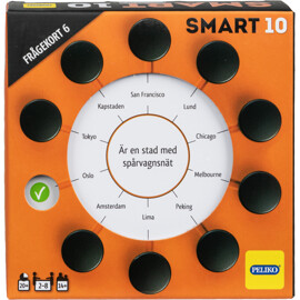 Testa era frågespelskunskaper med 200 nya frågor och 2000 svar kring allmänbildande trivia om stort och smått, från Sverige och hela världen. Här blandas fakta med finess och små klurigheter med skratt, perfekt för dig som gillar smart underhållning! Förpackningen innehåller 100 dubbelsidiga frågekort.För att kunna använda frågekorten behövs även Smartboxen ur något av SMART10-brädspelen. Korten i alla SMART10-spel och frågeutgåvor är kompatibla med alla Smartboxar och med varandra – blanda ihop och skapa din favoritmix av olika frågeutgåvor!
