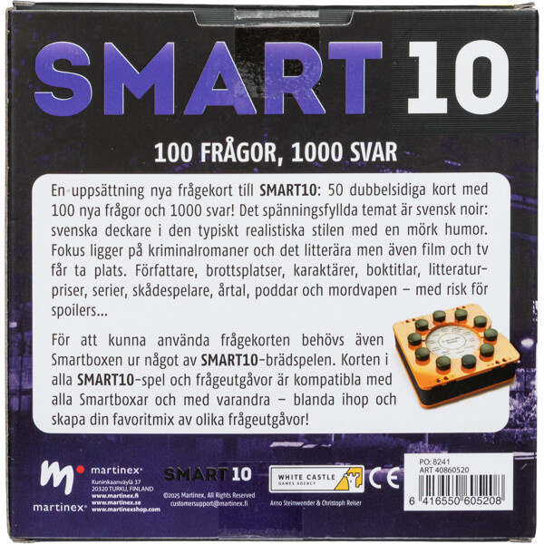 Det spänningsfyllda temat är svensk noir: svenska deckare i den typiskt realistiska stilen med en mörk humor. Fokus ligger på kriminalromaner och det litterära men även film och tv får ta plats. Författare, brottsplatser, karaktärer, boktitlar, litteraturpriser, serier, skådespelare, årtal, poddar och mordvapen – med risk för spoilers… För att kunna använda frågekorten behövs även Smartboxen ur något av SMART10-brädspelen. Korten i alla SMART10-spel och frågeutgåvor är kompatibla med alla Smartboxar och med varandra – blanda ihop och skapa din favoritmix av olika frågeutgåvor!