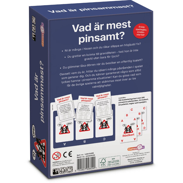 Det är utformat för gruppspel och uppmuntrar till skratt och livliga diskussioner när spelarna delar med sig av sina egna erfarenheter och bestämmer vilka scenarier som är mest pinsamma. Det är lätt att förstå och spela och är ett perfekt val för fester och sammankomster, vilket ger oändlig underhållning och en chans att knyta an till delad pinsamhet.