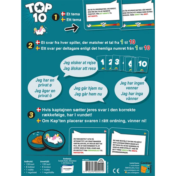 Top 10 – Sällskapsspelet där galenskap möter genialitet!Top 10 är det perfekta partyspelet för dig som älskar tokiga teman, oväntade svar och att läsa av dina vänner. Med enhörningar, bajshögar och en galen blandning av frågor kommer ni garanterat att skratta högt vid varje spelomgång!Hur går det till?Varje runda får alla ett hemligt nummer mellan 1 och 10. En spelare – Kap’ten – läser upp ett tema. Resten av spelarna ska svara så att deras svar motsvarar deras nummer. Från "helt värdelöst" till "fullständigt fantastiskt" – kan Kap’ten lista ut rätt ordning?Exempel:Du är på speed dating – säg något som får dig att framstå som en riktigt bra person, från sämst till bäst…➤ Jag har inga vänner.➤ Jag går hem nu.➤ Jag älskar att resa.➤ Jag äger en privat ö.(Kan du gissa rätt ordning?)Innehåll:135 kort8 brickor1 spelmattaregelhäfteAntal spelare: 4–9.Speltid: Ca 30 min.Språk: Svenska och Danska.Vinnare av årets partyspel i Sverige 2025.