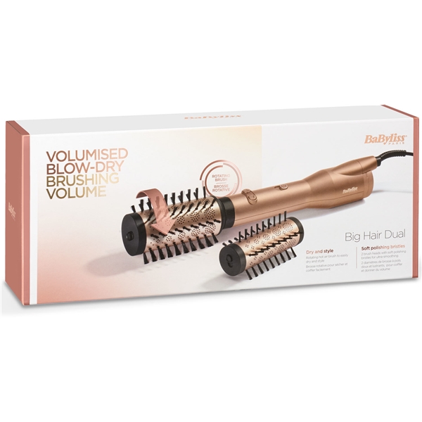 Varmluftsborsten har två utbytbara borsthuvuden i olika storlekar för varierad volym och alla hårlängder.