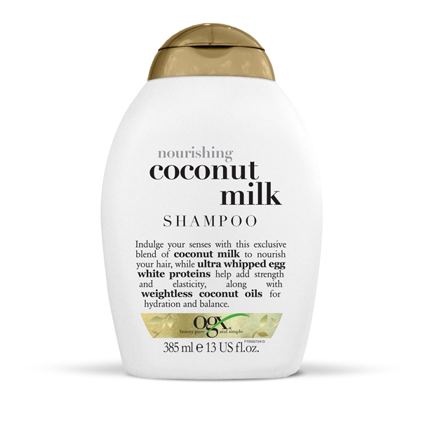 Coconut Milk Shampoo från OGX har en härligt krämig kombination av näringsrik kokosmjölk, stärkande äggproteiner och återfuktande kokosolja. Gör håret mjukt och glänsande med en mild kokosdoft.