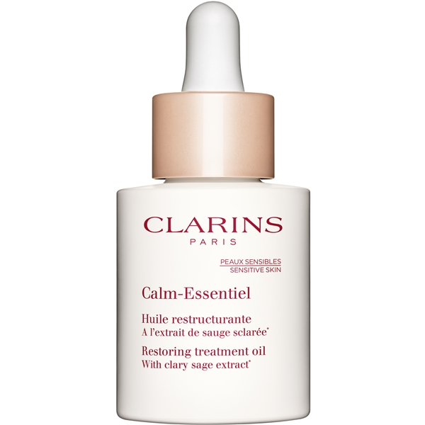 Clarins Calm Essentiel Restoring Treatment Oil är en SOS-olja för en reaktiv hud som omedelbart lugnar, ger näring och skydd till en hud som är känslig och försvagad.