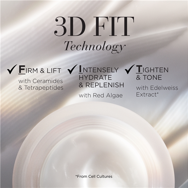 Nattkrämen är framtagen med en åldersbekämpande 3D FIT-teknik som stärker- och intensivt återfuktar huden, samt verkar uppstramande. En ultra-rik och silkeslen kräm som är berikad med Ceramider, Tetrapeptider och Edelweiss Extract vilka låter dig se ett synligt lyft-, uppstramat- och skulpturerat resultat efter bara 1 vecka.