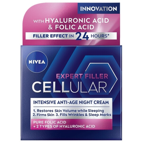 NIVEA Cellular Expert Filler Night Cream är en nattkräm med en innovativ formula som innehåller en kombination av kraftfulla anti-age aktiva ämnen som ger utfyllande effekt på 24 timmar (testad på hudceller) och bekämpar förlust av fasthet och volym för att ge en hud som ser yngre ut.