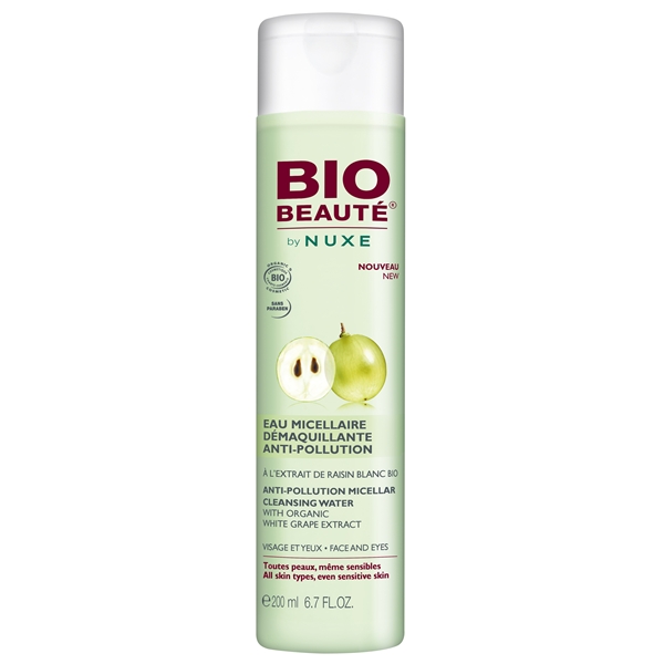 Anti Pollution Micellar Cleansing Water från Bio Beauté by Nuxe är ett effektivt rengöringsvatten som i ett enda snabbt steg avlägsnar orenheter och makeup från ansikte och ögon, samt befriar huden från föroreningar och dess skadliga effekter. Passar alla hudtyper även en känslig och respekterar hudens naturliga balans. En micellär formula fungerar som en magnet som drar bort smuts, orenheter och makeup. Lämnar huden ren och mjuk. Den innehåller:
