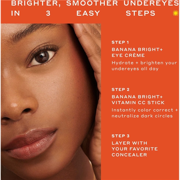 Banana Bright+ Vitamin CC Sticks ljusar upp, återfuktar och neutraliserar de svåraste mörka ringarna under ögonen och ger en direkt uppiggande effekt. Formulan är skapad med två former av förstärkt C-vitamin, energigivande koffein och lystergivande pigment för att omedelbart ljusa upp och minimera synligheten av mörka ringar och missfärgningar i huden.