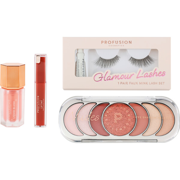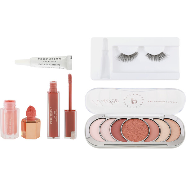 Det innehåller ett flytande rouge för naturlig färg, en återfuktande lip tint med lätt färg och glans, en ögonskuggspalett med 4 nyanser för allt från diskreta vardagslooker till intensiva kvällsmakeup, samt ett par lösögonfransar med transparent lim för enkel applicering.