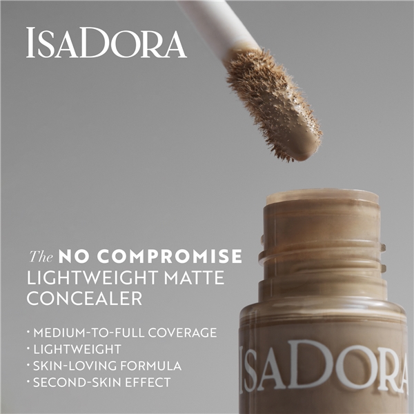 IsaDora No Compromise Lightweight Concealer är en fjäderlätt concealer med full täckning och hudvårdande egenskaper som ger en matt naturlig finish.
