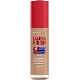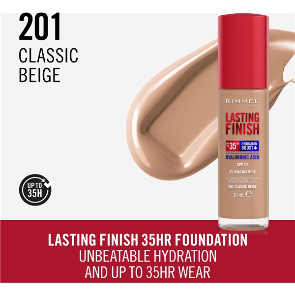Rimmel Lasting Finish 35 HR Foundation ger oslagbar återfuktning och upp till 35 timmars hållbarhet. Den är Rimmels mest återfuktande foundation som håller länge. En heltäckande vegansk foundation med en naturlig finish och andningsbar formula. Kliniskt bevisad att förbättra hudens lyster.